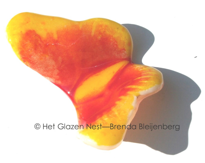 De vlinder zie u hier ziet is gemaakt in opaal glas. Dit is glas waar niet doorheen gekeken kan worden. De vlinder blijft dus altijd de vlinder, ongeacht wat de ondergrond is. De kleuren lijken zich met elkaar te vermengen. Het is alsof de “schilderskwast” over het glas heeft geverfd.