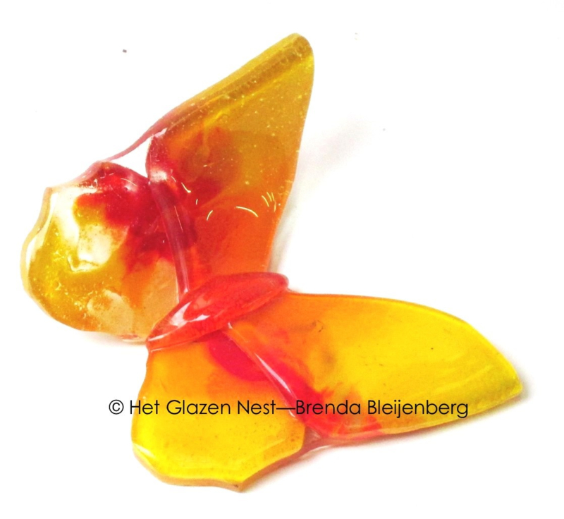 Glaskunst vlinder in oranje en geelGlaskunst vlinder in oranje en geel